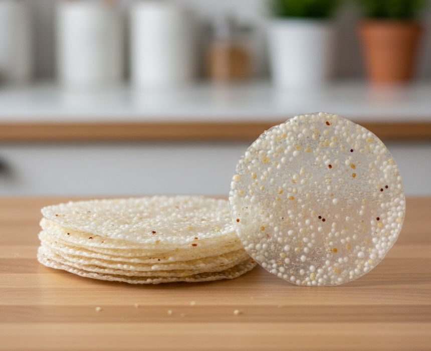 Enjoy Sagu Masala Kapada (Papad) Online, a traditional Odisha rice kapada known for its light texture and airy crunch. Skilled makers prepare this kapada using a blend of rice flour and sago (sabudana). The combination creates a crisp structure that puffs beautifully when cooked.